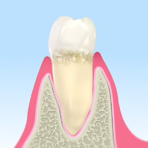 歯周病の主な原因は「歯ぐきに付着した歯垢や歯石」です。歯垢や歯石の中には大量の菌が存在し、毒素を出して歯ぐきにダメージを与えます。はじめは歯ぐきの軽い腫れや出血がおこる「歯肉炎」ですが、進行すると歯を支える歯槽骨や歯根膜にまで感染が広がり、歯にグラつきがみられる「歯周炎」へと変わります。